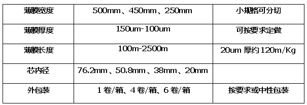手用拉伸膜 a、厚度(Thickness):15mic-20mic b、寬度(Width):5cm-45CM c、拉伸率(Elongation):200%-400% d、顏色(Colour):透明(可根據客戶需求定制其它顏色) |